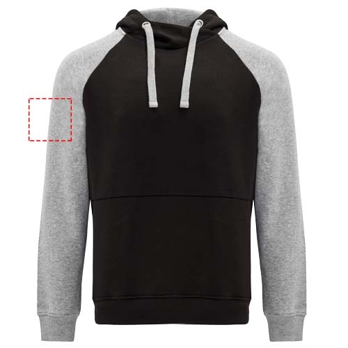 Felpa con cappuccio unisex bicolore. Cappuccio con collo incrociato e occhielli in metallo. Cappuccio interno a contrasto, cordoncino e maniche raglan. Tasca a canguro. Polsini e orlo in maglia a coste 1x1 in elastan. Etichetta rimovibile.