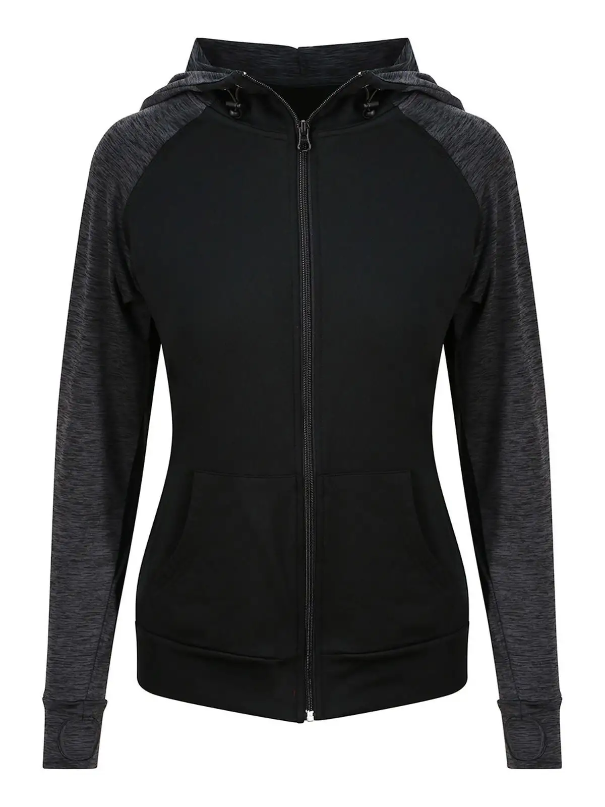 Corpo: 89% poliestere 11% elastan. Felpa con cappuccio e maniche raglan da donna, tessuto misto poliestere, maniche melange a contrasto, tessuto traspirante ad asciugatura rapida, cappuccio regolabile, tasca a marsupio, zip intera, fori per i pollici.