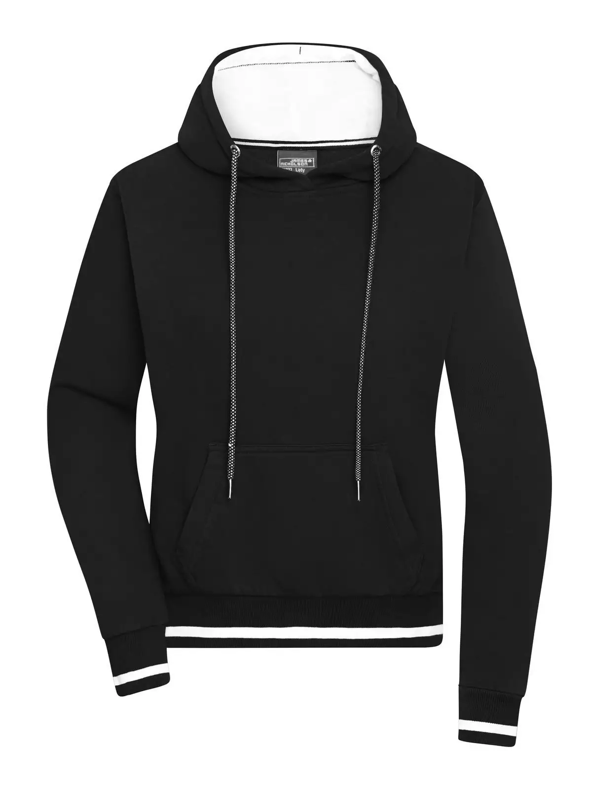 Felpa trendy con cappuccio. Tessuto esterno (300 g/m²), tessuto morbido e di alta qualità, internamente felpato, polsini a maglia di elastan, strisce contrastanti nei polsini e in vita, cappuccio a due strati contrastanti, tasca canguro, leggermente avvitata, taglio casual.Felpa trendy con cappuccio.