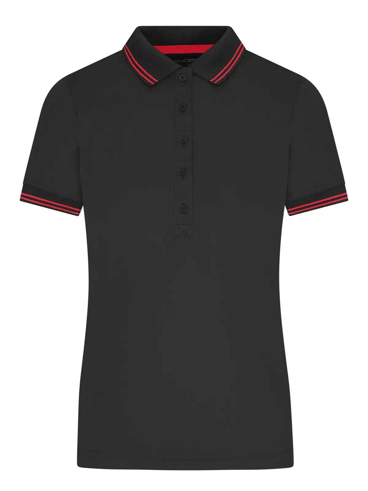 Pratica polo in poliestere, traspirante, regola l'umidità e asciuga rapidamente, colletto e polsini in maglia con righe a contrasto, spacchi laterali, leggermente sciancrata, 5 bottoni.