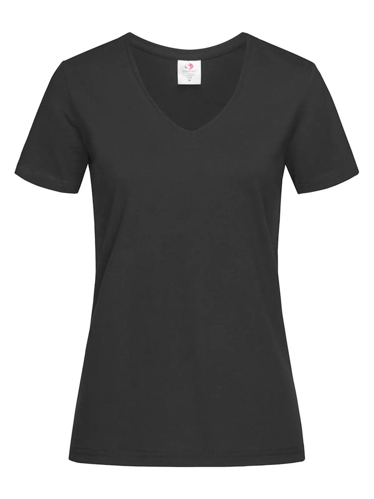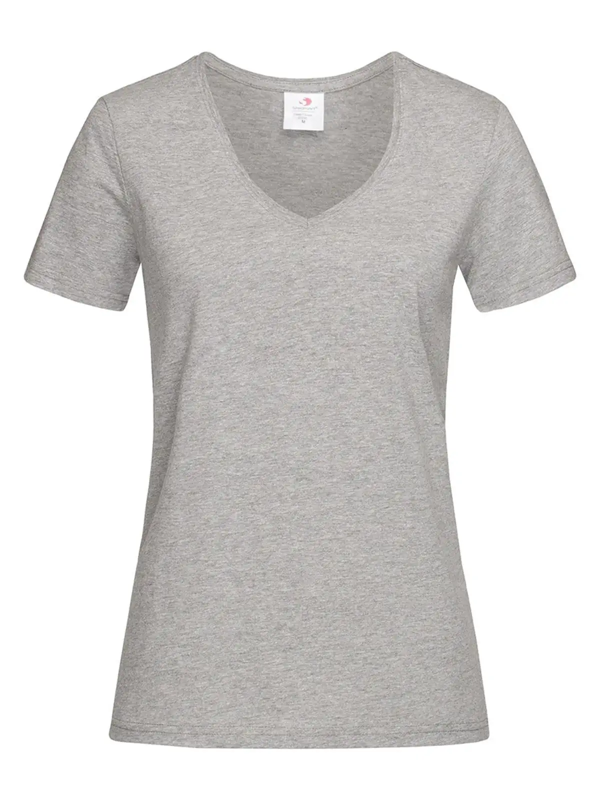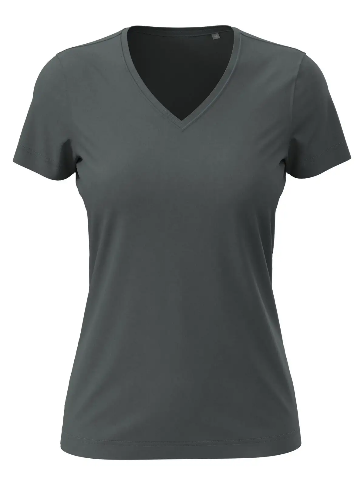 T-shirt manica corta, set-in, ampio scollo a V, struttura con cuciture laterali, etichetta strappabile. Col. GYH: 85% cot. 15% visc.