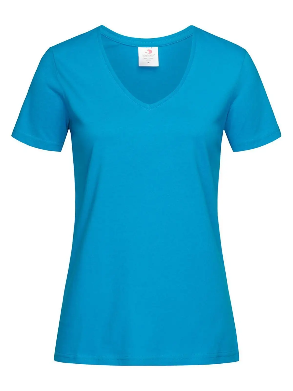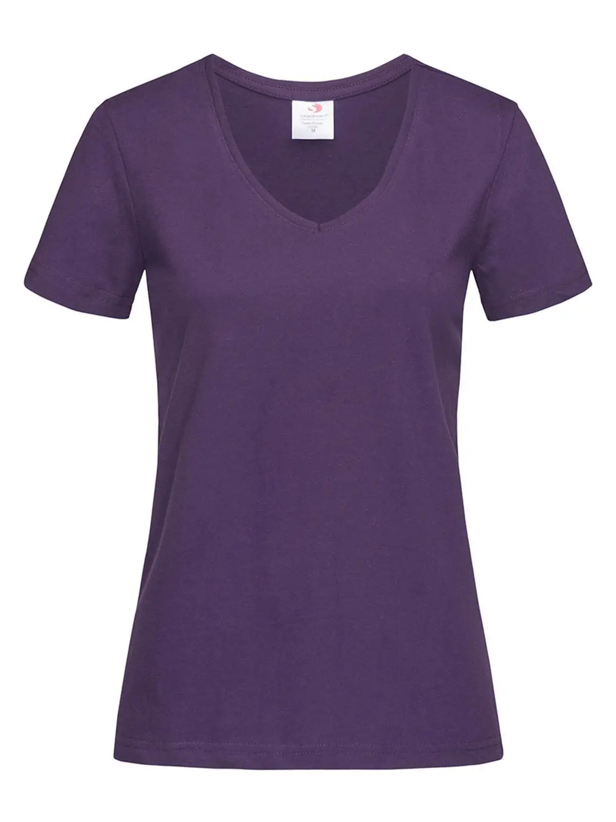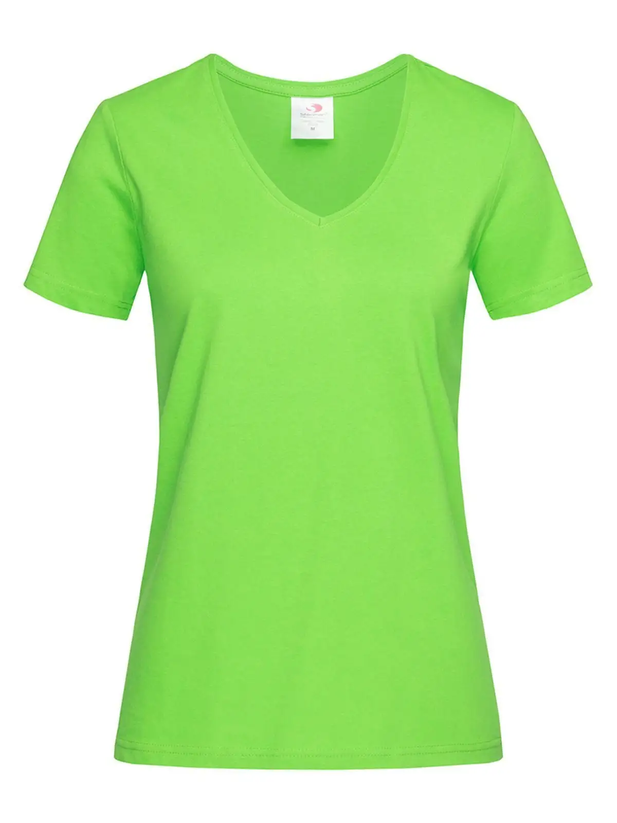 T-shirt manica corta, set-in, ampio scollo a V, struttura con cuciture laterali, etichetta strappabile. Col. GYH: 85% cot. 15% visc.