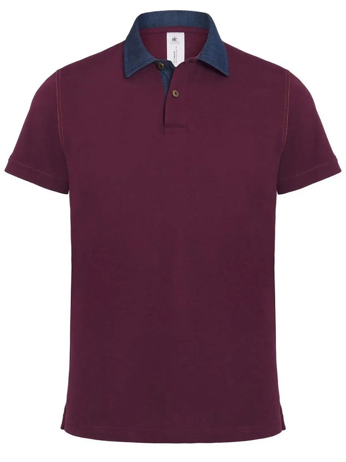 Polo a maniche corte, set-in, colletto in denim, due bottoni in ottone anticato, cuciture di colore contrastante e spacchetti laterali con dettagli interni in denim. Struttura con cuciture laterali. Col. DH933: 90% cot. 10% vis.