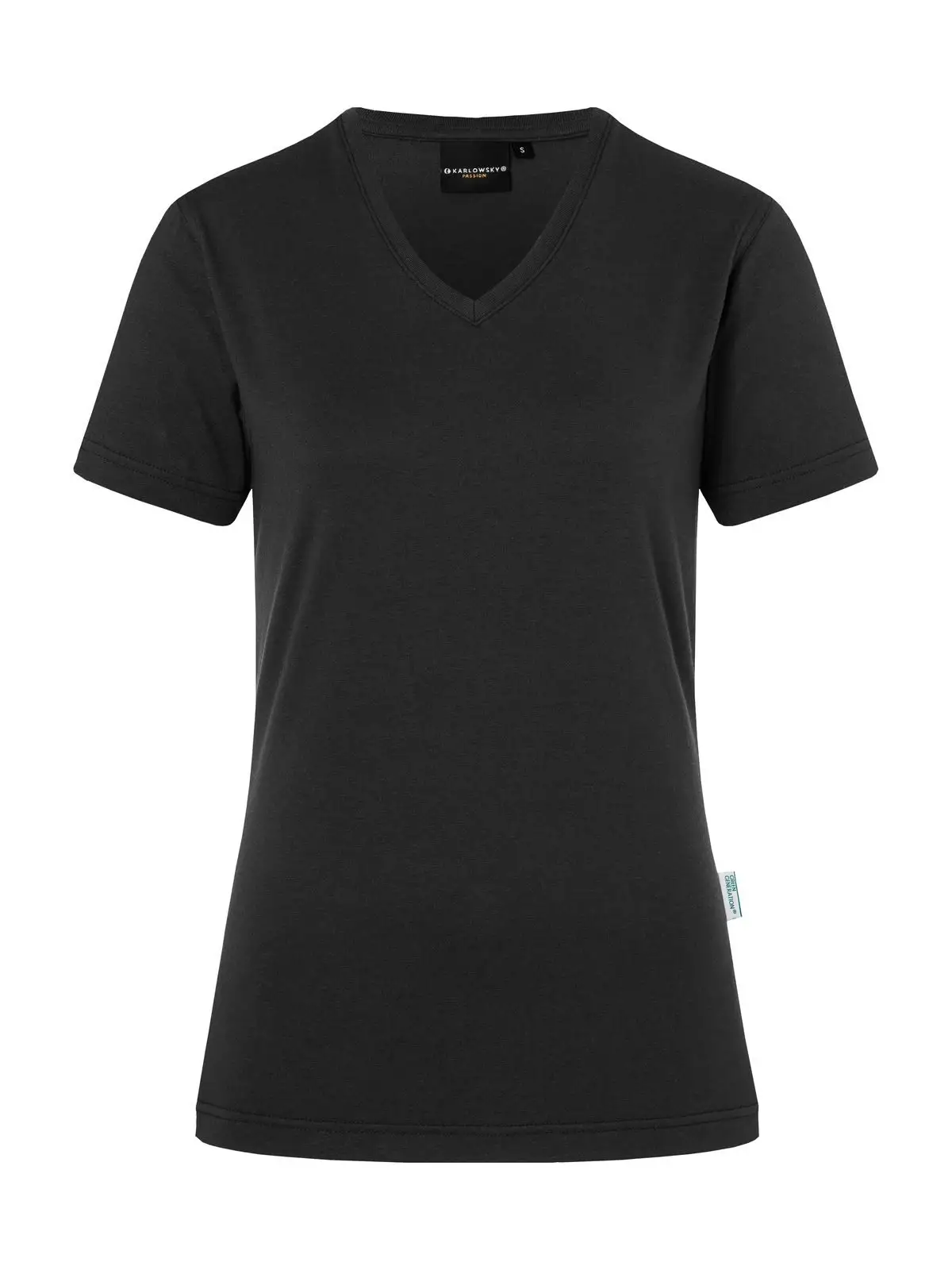 T-shirt da donna in materiale resistente e sostenibile, easy-care. Leggermente sfiancata, collo a V con elastan, banda di rinforzo al collo. Prodotto certificato GRS, Green Button e Oeko-Tex.
