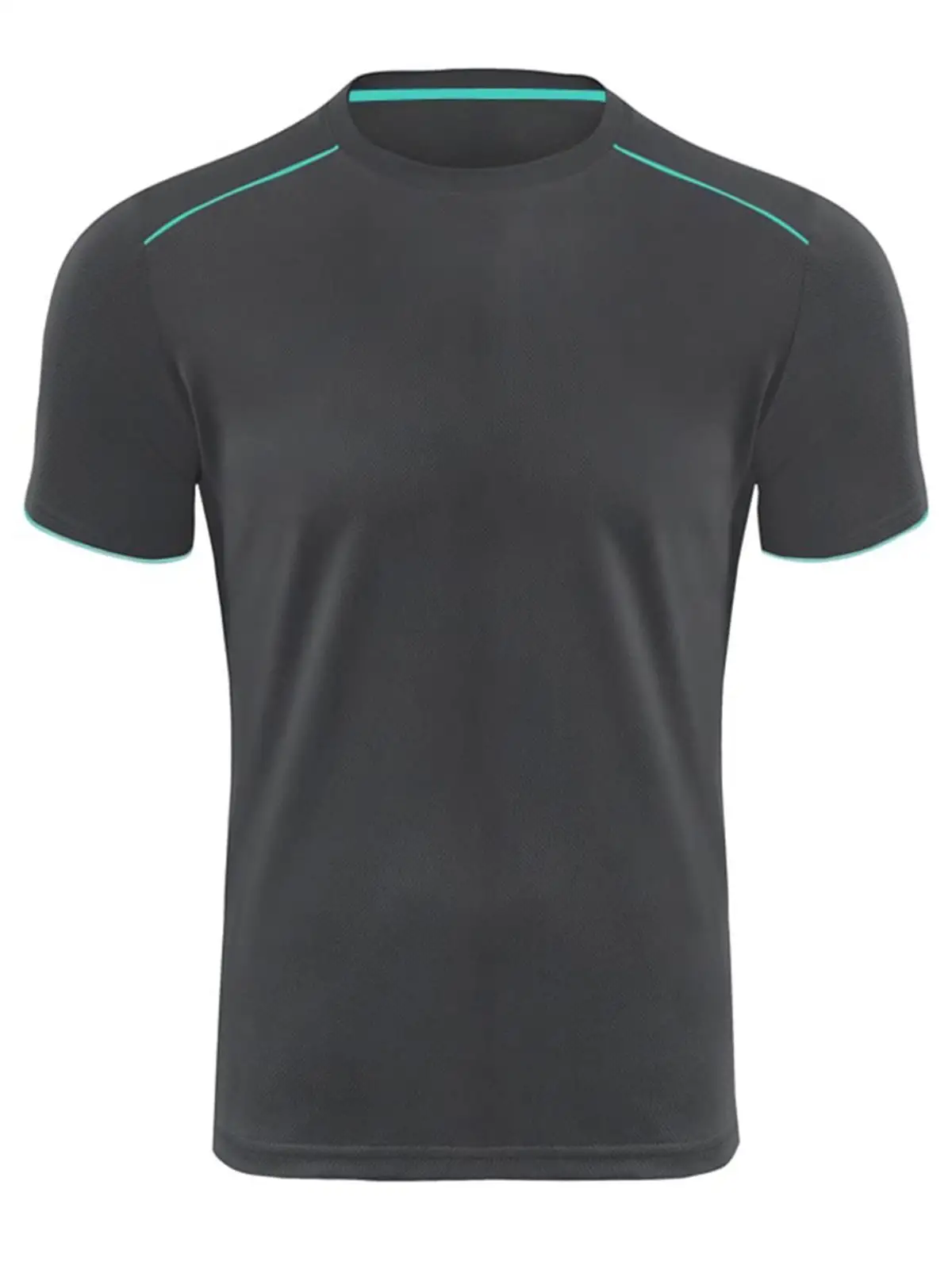 T-shirt tessuto performance, maniche set in, parasudore in contrasto, bordini in colore a contrasto su linea spalle davanti e dietro e su fondo manica, cuciture laterali, etichetta strappabile.
