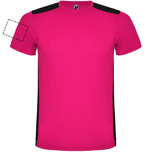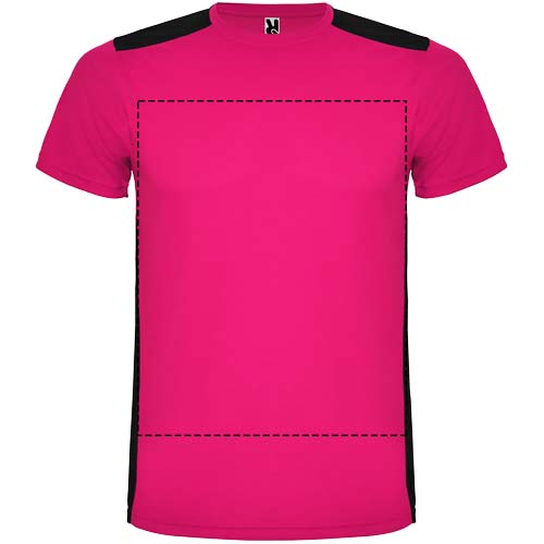 Tessuto tecnico traspirante che si asciuga rapidamente. Girocollo. Combinazione di due tessuti in poliestere sul retro e sulle spalle. Tessuto a occhio di pernice sul davanti e tessuto mesh 3D traspirante sul retro. Tessuto realizzato per assorbire l'umidità. Cucitura decorativa a zigzag con impuntura sui lati e sulle spalle. Parte posteriore leggermente più lunga. Etichetta rimovibile.