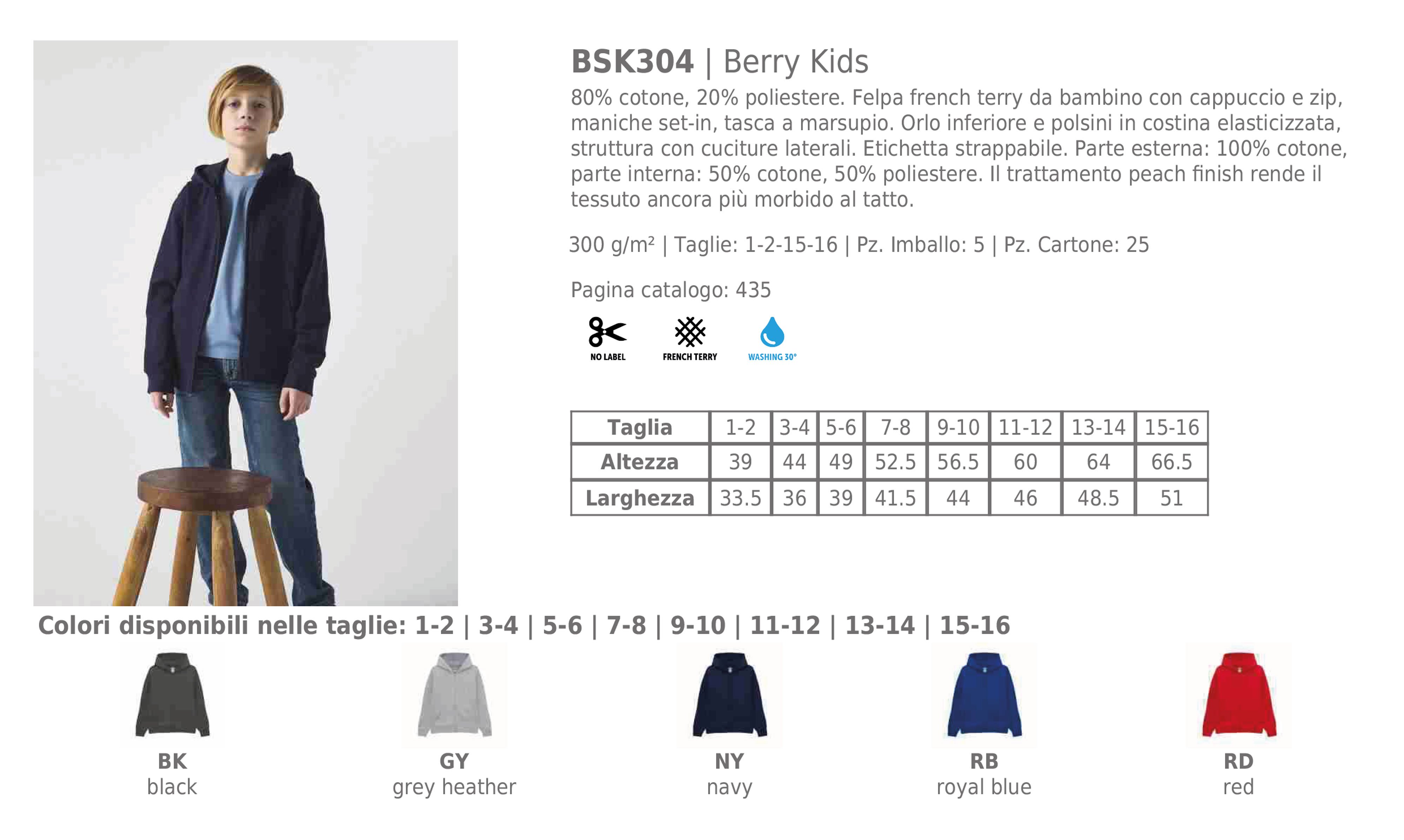 80% cotone 20% poliestere, peach finish. Felpa french terry da bambino con cappuccio e zip, maniche set-in, tasca a marsupio. Orlo inferiore e polsini in costina elasticizzata, struttura con cuciture laterali. Etichetta strappabile. Parte esterna: 100% cotone, parte interna: 50% cotone, 50% poliestere. Il trattamento peach finish rende il tessuto ancora più morbido al tatto.