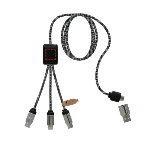 Questo cavo di ricarica da 1 metro e 60 W è caratterizzato da un'elegante finitura in gomma e metallo, cavi realizzati in bottiglie di plastica riciclate e da due loghi illuminati, ciascuno personalizzabile e diverso dall'altro. Dotato di tre connettori (2 x Tipo-C e 1 x Lightning), può caricare due o tre dispositivi contemporaneamente. Il doppio ingresso USB-A e USB-C garantisce la completa compatibilità con i computer più recenti, compresi i modelli USB-C. Il cavo è personalizzabile su entrambi i lati ed è confezionato in una custodia in TPU riciclabile con un cartoncino di supporto in carta riciclata.