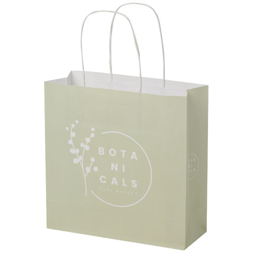 Shopper piccolo in carta kraft da 120 g/m² (24 x 9 x 24 cm) con manici di carta intrecciati. La parte anteriore e posteriore personalizzabili offrono un ampio spazio per stampare un logo o qualsiasi altro design, rendendolo un ottimo strumento di marketing aziendale. Realizzato in Europa e riciclabile al 100%, questo sacchetto è una scelta più sostenibile per aziende e persone attente all'ambiente in cerca di una soluzione per il confezionamento sostenibile.