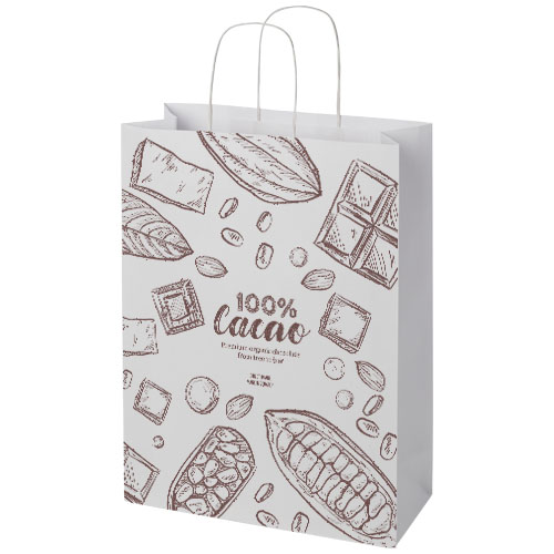 Shopper XXL in carta kraft da 120 g/m² (31 x 12 x 41 cm) con manici di carta intrecciati. La parte anteriore e posteriore personalizzabili offrono un ampio spazio per stampare un logo o qualsiasi altro design, rendendolo un ottimo strumento di marketing aziendale. Realizzato in Europa e riciclabile al 100%, questo sacchetto è una scelta più sostenibile per aziende e persone attente all'ambiente in cerca di una soluzione per il confezionamento sostenibile.