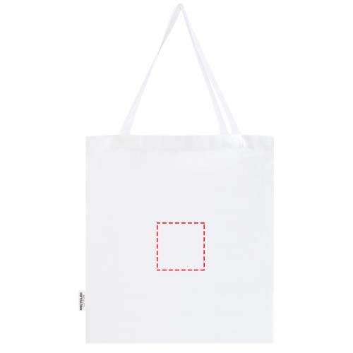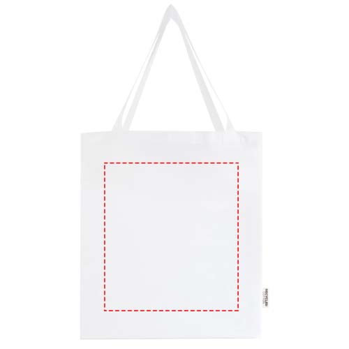 La tote bag a soffietto Madras realizzata in cotone riciclato al 100% certificato GRS è perfetta da regalare durante un evento, una conferenza, oppure da utilizzare come shopper per la spesa. La densità del cotone di 140 g/m² rende questa borsa robusta, resistente e adatta per trasportare oggetti pesanti nello scomparto principale. Grazie ai manici a spalla lunghi 30 cm, questa tote bag è facile da trasportare. Anche i metodi di stampa disponibili per questa tote bag sono certificati GRS, assicurando che l'intera catena di fornitura sia trasparente e certificata. Realizzata in India. Resistenza fino a 5 kg di peso.