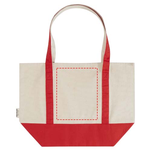 La tote bag Sam realizzata in cotone riciclato e certificato GRS al 100% è perfetta per un picnic o per lo shopping. La densità del cotone di 320 g/m² rende questa borsa robusta, resistente e adatta per trasportare oggetti pesanti nello scomparto principale grazie ai manici doppi. Anche i metodi di stampa disponibili per questa tote bag sono certificati GRS, assicurando che l'intera catena di fornitura sia trasparente e certificata. Lunghezza del manico: 30 cm. Resistenza fino a 10 kg di peso. Capacità: 15 litri. Realizzata in India.