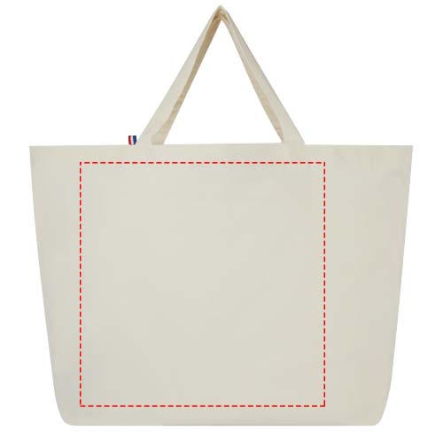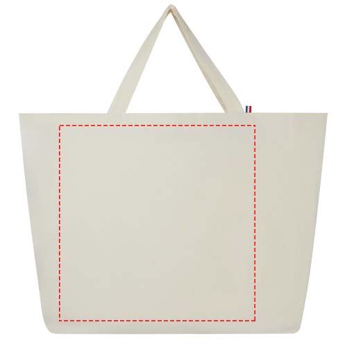 Questa Tote bag di grande capacità è realizzata con i materiali migliori, riciclati al 100%. È costruita per essere utilizzata nella vita di tutti i giorni ed è adatta a trasportare libri pesanti o generi alimentari. La miscela di cotone/poliestere riciclato da 200 g/m² garantisce durata e affidabilità, conferendo alla borsa una resistenza fino a 14 kg di peso. I filati provengono dall'Asia, ma la tessitura, la filatura e la produzione avvengono in Francia.