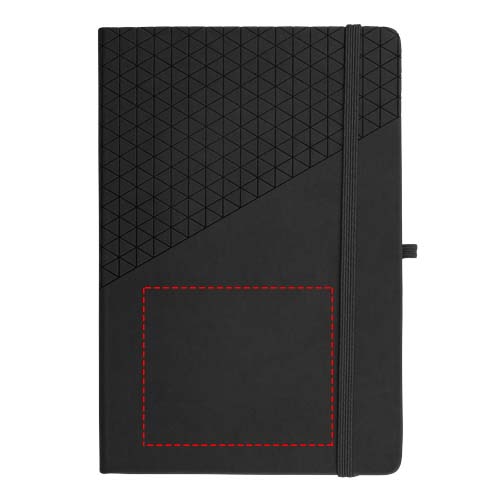 Notebook A5 dal design geometrico con finitura morbida. Composto da 80 pagine (80gsm) a righe, segnapagina, chiusura elastica e anellino portapenna.