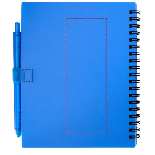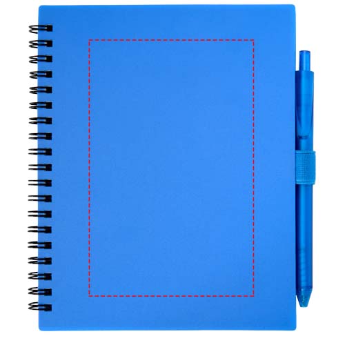 Il blocco note con copertina morbida Niove è realizzato in plastica riciclata con 70 fogli punteggiati di carta da 70 g/m². Il blocco note presenta angoli quadrati e un passante per le penne. Dimensioni del blocco note: 140 x 178 mm. Anche la penna a sfera è realizzata in plastica riciclata. Colore dell'inchiostro: Blu. Capacità di scrittura: 1000 metri. Dimensione del pennino: 1,0 mm.