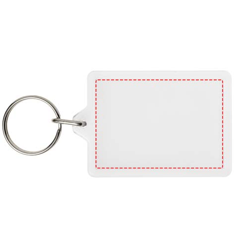 Portachiavi C1 rettangolare trasparente con anello in metallo diviso. L'anello di metallo a loop ha un profilo piatto ideale per le spedizioni. Dimensioni dell'inserto stampato: 5,0 cm x 3,5 cm.
