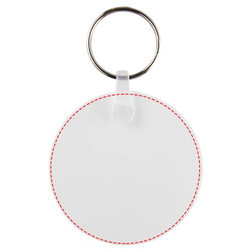 Portachiavi a forma di cerchio di colore bianco con anello in metallo. L'anello di metallo ha un profilo piatto ideale per le spedizioni.