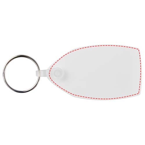 Portachiavi a forma rettangolare di colore bianco con anello in metallo. L'anello di metallo ha un profilo piatto ideale per le spedizioni.