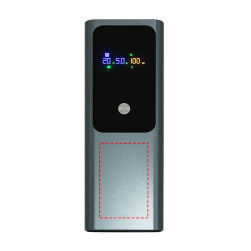 Potente power bank per computer portatile da 100 W (20.000 mAh) in grado di ricaricare più dispositivi quando si è in giro grazie alle due porte USB-C e USB-A. Dotato di un display TFT smart per conoscere lo stato della batteria in tempo reale. Fornito in un sacchetto di cotone riciclato e in una confezione regalo di cartone riciclato.