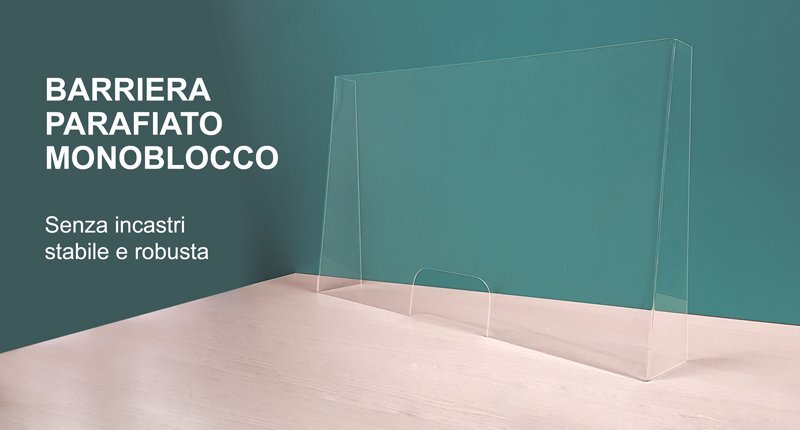 La Barriera di sicurezza è prodotta in Plexiglas® o policarbonato trasparente 2/3/4 mm. Si tratta di un pannello in polimetacrilato trasparente e infrangibile, più leggero e resistente del vetro e particolarmente adatto alla stampa.